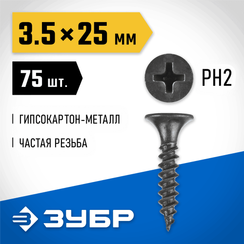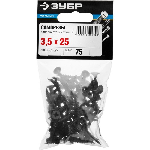 ЗУБР 25 х 3.5 мм, 75 шт., СГМ саморезы гипсокартон-металл 300016-35-025 Профессионал