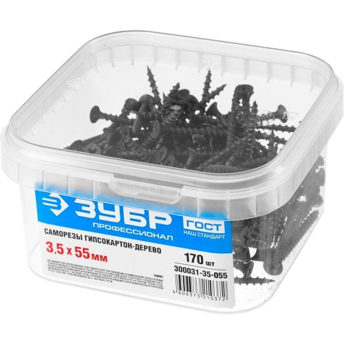Саморезы гипсокартон-дерево ЗУБР 300031-35-055, предназначены для крепления гипсокартона к деревянной обрешетке, не допуская крошение волокнистой структуры дерева. Саморезы легко вкручиваются обычным шуруповертом или отверткой с крестообразным шлицем PH2 (DIN). Предварительное сверление в скрепляемых материалах не требуется. Фосфатированное покрытие обеспечивает защиту от коррозии. Широко применяются при выполнении бытового ремонта, сборке и установке различных конструкций. Саморезы для гипсокартона изготовлены из стального прутка с высоким содержанием углерода. Контроль геометрии самореза начинается с калибровки прутка и заканчивается тщательной проверкой размеров готового изделия. Нормативная твердость стали достигается термической обработкой. Поверхностная твердость 450-720HV, твердость в сердцевине 290-450HV.