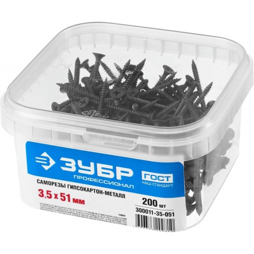 Саморезы гипсокартон-металл ЗУБР 300011-35-051, предназначены для крепления гипсокартона к металлическому профилю и твердым породам дерева. Фосфатированное покрытие обеспечивает защиту от коррозии. Саморезы для гипсокартона изготовлены из стального прутка с высоким содержанием углерода. Контроль за геометрией самореза начинается с калибровки прутка и заканчивается тщательной проверкой размеров готового изделия. Нормативная твердость стали достигается термической обработкой. Поверхностная твердость 550-720HV, твердость в сердцевине 290-450HV. Широко применяются при выполнении бытового ремонта, сборке и установке различных конструкций. Саморезы легко вкручиваются обычным шуруповертом или отверткой с крестообразным шлицем PH2 (DIN). Предварительное сверление в скрепляемых материалах не требуется.