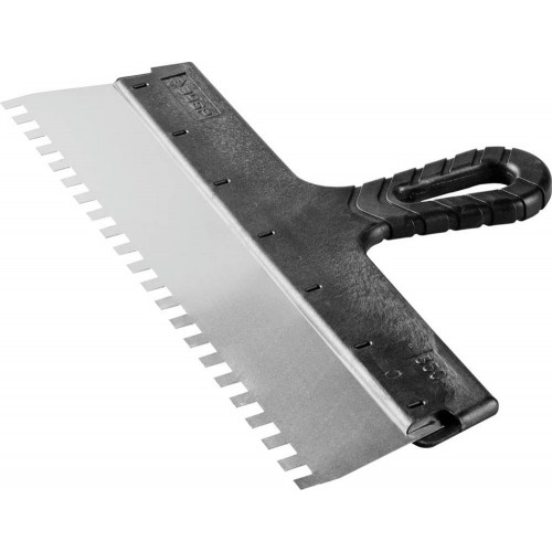 Благодаря зубчатой кромке шпатель идеально подходит для работы со строительными и клеевыми смесями, полотно из нержавеющей стали обеспечивает надежность и долгий срок службы инструмента, а удобная пластмассовая рукоятка создает условия для комфортной работы