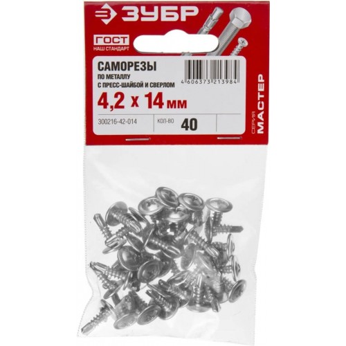 ЗУБР 14 х 4.2 мм, 40 шт., ПШМ-С саморезы с прессшайбой и сверлом для листового металла 300216-42-014 Мастер