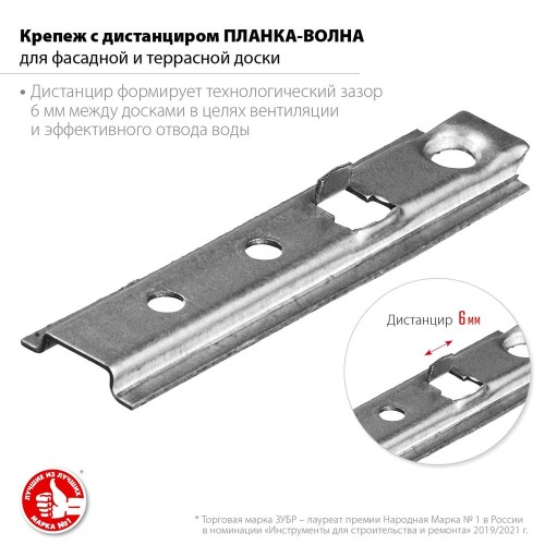 Крепеж с дистанциром для фасадной и террасной доски Планка-Волна ЗУБР 30703-75, предназначен для существенного ускорения и облегчения проведения отделочных работ, обладая при этом рядом преимуществ по сравнению с традиционным креплением при помощи гвоздей. Крепление имеет эстетичный внешний вид, поскольку крепеж невидим за доской. Дистанцир обеспечивает зазор 6мм между досками. Изготовлен из высококачественной листовой стали. Цинковое покрытие надежно защищает от коррозии.