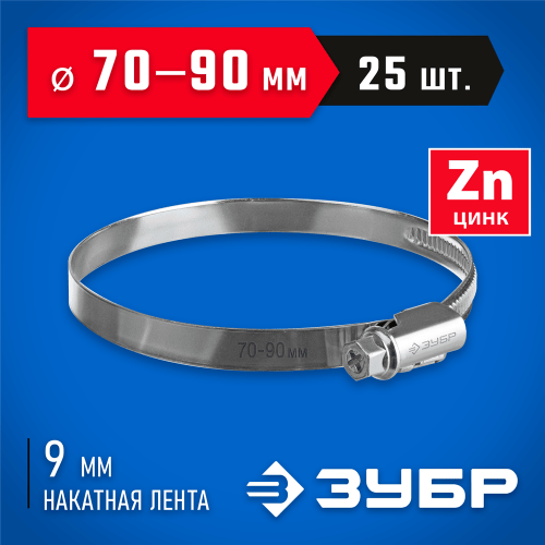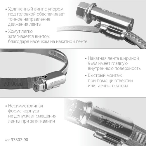 Червячный хомут ЗУБР 37807-90 предназначен для крепления шлангов к патрубкам, работающим в условиях низких и средних давлений и вибраций, а также кабелей и проводов. Состоит из штампованной ленты и винта с червячной резьбой. Накатная лента с гладкой внутренней поверхностью предотвращает повреждения скрепляемых материалов. Шестигранная головка и шлиц PH позволяют использовать при монтаже гаечный ключ или шлицевую отвертку. Цинковое покрытие надежно защищает от коррозии.