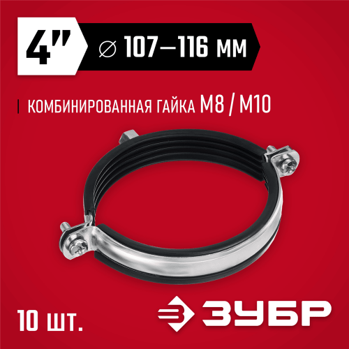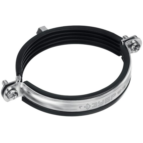 Хомут трубный оцинкованный ЗУБР 37880-107-116, предназначен для крепления труб различного назначения к любым основаниям при помощи сантехнической шпильки и дюбеля (не входит в комплект поставки). Монтаж на шпильку с резьбой М8 или М10. Уплотнитель из высококачественной морозостойкой резины поглощает вибрацию (шум). Два ребра жесткости придают изделию дополнительную прочность. Цинковое покрытие надежно защищает от коррозии.