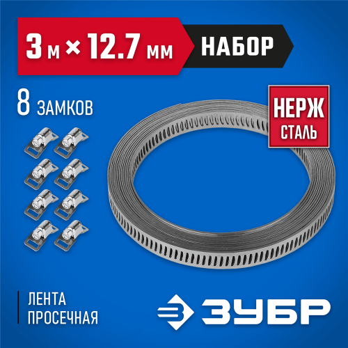 - В комплект набора входят нержавеющая просечная лента 12,7 мм х 3 м и 8 универсальных замков