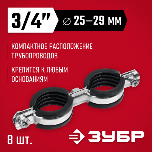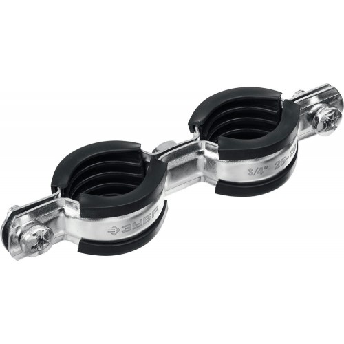 Хомут трубный оцинкованный ЗУБР 37890-25-29, предназначен для крепления труб различного назначения к любым основаниям при помощи сантехнической шпильки и дюбеля (не входит в комплект поставки). Экономия на материалах и времени монтажа: одна шпилька и один хомут на 2 трубопровода, для зажима труб закручиваются два винта вместо четырех. Конструкция хомута облегчает прокладку трубопроводов вплотную к внутренним и наружным углам. Уплотнитель из высококачественной морозостойкой резины поглощает вибрацию (шум). Два ребра жесткости придают изделию дополнительную прочность. Цинковое покрытие надежно защищает от коррозии.