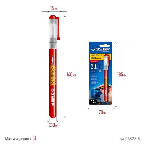 Перманентный маркер ЗУБР Колибри-20 06328-3, предназначен для нанесения разметки. Перманентный, водостойкий практически на всех материалах, пишет практически на любой поверхности: пластик, дерево, металл, бетон, стекло, бумага, картон. Заостренный наконечник маркера позволяет делать тонкие надписи на мелких и узких предметах. Так как перманентный маркер пишет практически на любой поверхности, он применяется в различных сферах, где требуется нанести надпись, рисунок, знак или указатель.