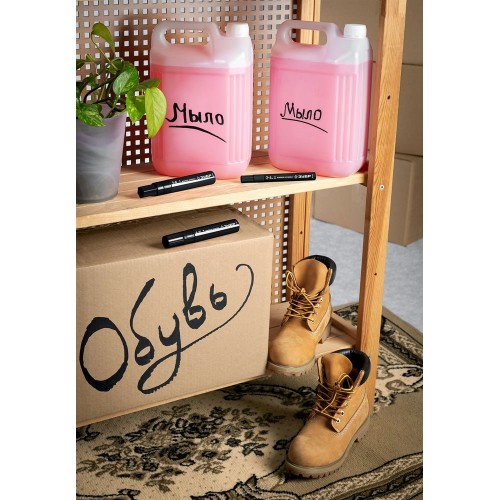 Универсальный маркер с жидкой быстросохнущей краской подходит практически для любой поверхности. Практичеки безопасен для человека, поскольку не имеет в составе токсичных веществ, таких как ксилол. Данный маркер не смывается водой, не выгорает на солнце и устойчив к температурным перепадам.