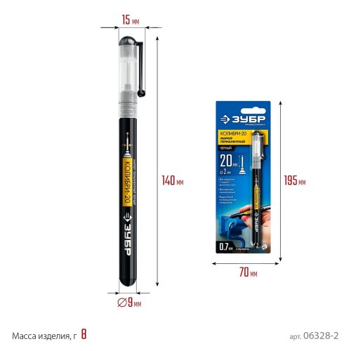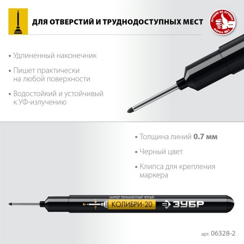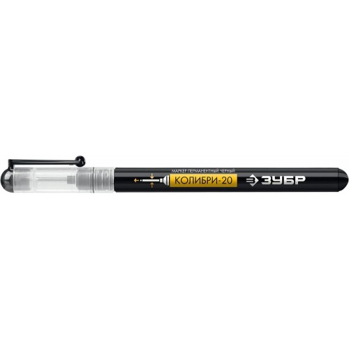 Перманентный маркер ЗУБР Колибри-20 06328-2_z01, предназначен для нанесения разметки. Перманентный, водостойкий практически на всех материалах, пишет практически на любой поверхности: пластик, дерево, металл, бетон, стекло, бумага, картон. Заостренный наконечник маркера позволяет делать тонкие надписи на мелких и узких предметах. Так как перманентный маркер пишет практически на любой поверхности, он применяется в различных сферах, где требуется нанести надпись, рисунок, знак или указатель.