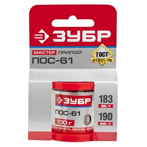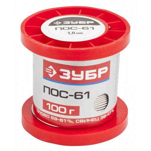 Припой для пайки ЗУБР 55450-100-10, предназначен для проведения паяльных работ. Лужение и пайка элементов электро- и радиоаппаратуры, печатных схем, точных приборов с высокогерметичными швами, где недопустим перегрев; пайка жести, обмоток электрических машин, монтажных элементов, моточных и кабельных изделий, радиаторов и листового цинка, оцинкованных деталей холодильных агрегатов, теплообменников, электроламп, кабельных оболочек, тонколистовой упаковки. Применяется при пайке изделий из меди, цинка, железа. Соответствует ГОСТ 21931-76.