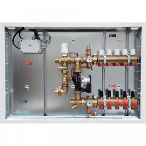 Распределительный коллектор с узлом смешения для низкотемпературных систем с фиксированным значением температуры, термостатический контроль, 3-х скоростной циркуляционный насос, предохранительный термостат K373, узел наполнения и слива, выпуск воздуха, измерительные термометры.