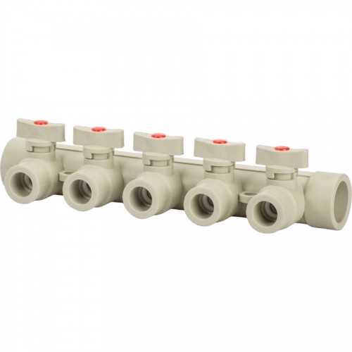 Коллектор с шаровыми кранами LAMMIN PPR представляет собой подающую трубу, на которой расположено три шаровых крана из полипропилена. Запирающие элементы шаровых кранов выполнены из нержавеющей стали. Коллектора для воды выполняют функцию подключения к одному источнику тепла нескольких распределительных трубопроводов.