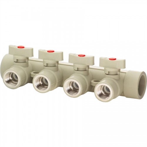 Коллектор с шаровыми кранами LAMMIN PPR представляет собой подающую трубу, на которой расположено три шаровых крана из полипропилена. Запирающие элементы шаровых кранов выполнены из нержавеющей стали. Коллектора для воды выполняют функцию подключения к одному источнику тепла нескольких распределительных трубопроводов.
