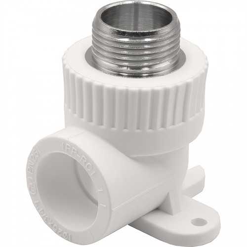 Угольник с наружной резьбой и креплением. Используется для соединения под углом 90° и одновременного крепления к вертикальной плоскости трубы PPR с резьбовым фитингом с внутренней резьбой.