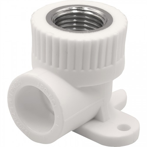 Угольник с внутренней резьбой и креплением используется для соединения под углом 90° и одновременного крепления к вертикальной плоскости трубы PPR с резьбовым фитингом с наружной резьбой.