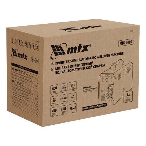 Инверторный аппарат полуавтоматической сварки MTX MIG-200S 94303, предназначенный для сварки на максимальном токе до 200 А, имеет продолжительность включения 60% и совместим с катушками весом до 5 кг. Используется для работы со сталями, черными и цветными металлами. Сварочный аппарат изготовлен с использованием передовой технологии IGBT, позволяющей получать стабильный сварочный ток на выходе. Аппарат имеет высокий КПД при низком энергопотреблении, способен работать при пониженном до 180 В напряжении.