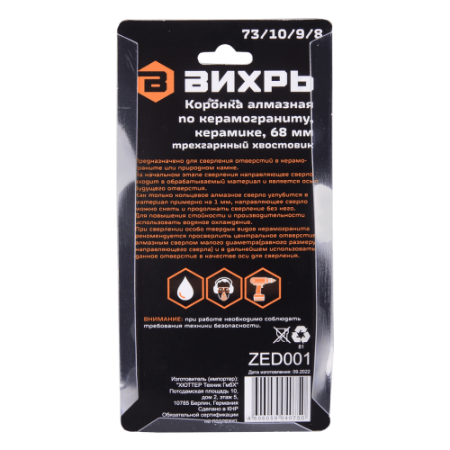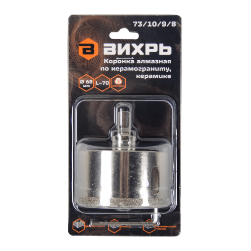Коронка алмазная Вихрь по керамограниту/керамике, 68 мм