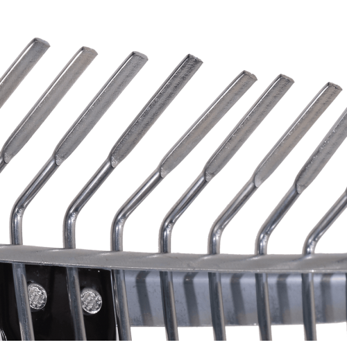 Зубья закреплены на подвижной, скользящей по черенку втулке, которая фиксируется эксцентриковым зажимом в любом необходимом положении, изменяя ширину захвата. Позволяет работать на узких участках.