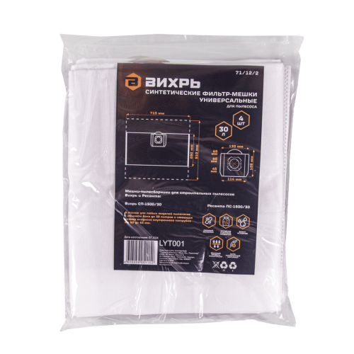 Мешки для строительного пылесоса синтетические 30л, 4шт Вихрь