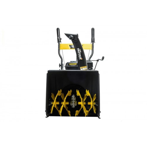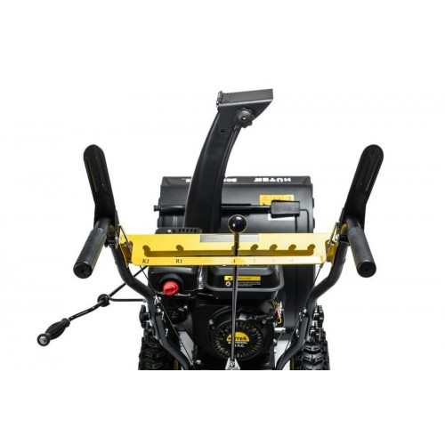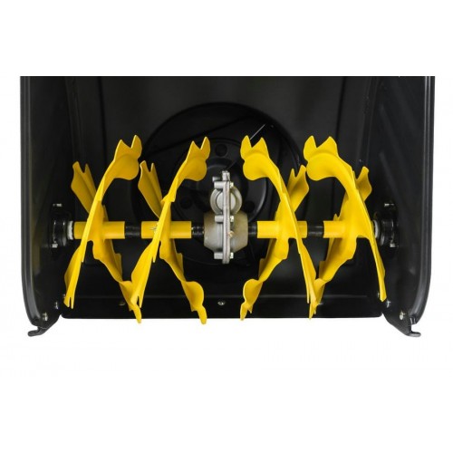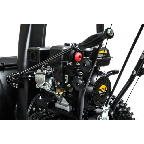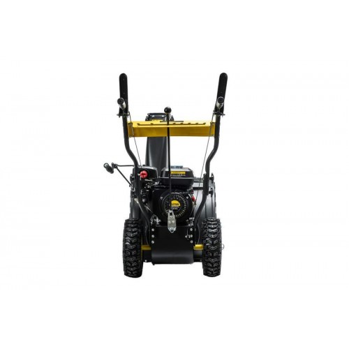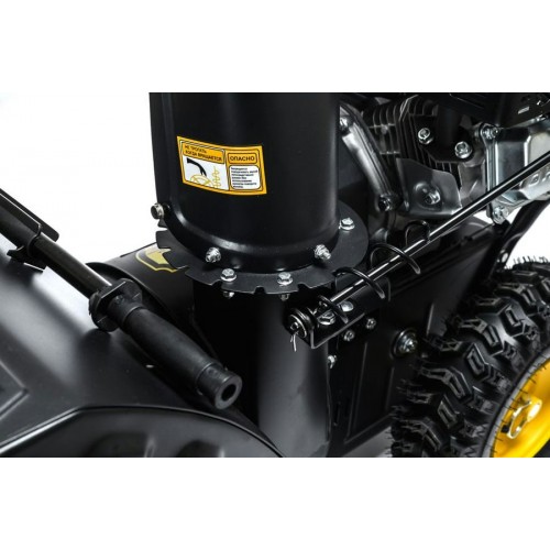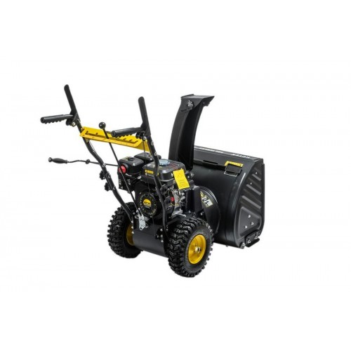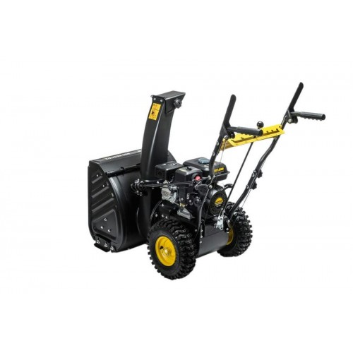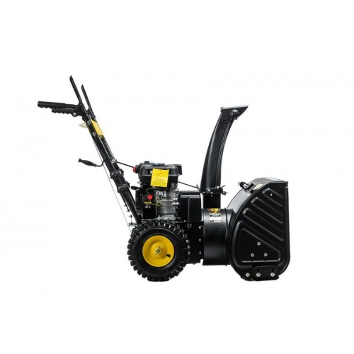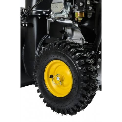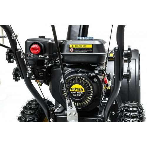 Четырехтактный бензиновый двигатель мощностью 7 л.с. имеет воздушную систему охлаждения. Металлический шнек с зубцами способен справиться с заледеневшим и слежавшимся снегом. Протектор на колесах защищает от проскальзываний на гололеде. Модель оснащена рукояткой, с помощью которой можно регулировать сторону для выброса снега даже во время работы.