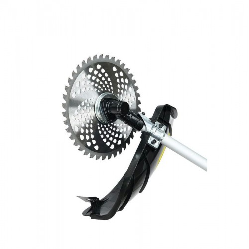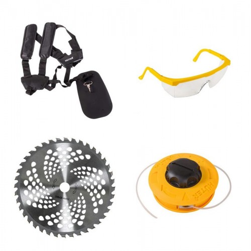 В комплектацию бензотриммера входит диск 40ТР. Он оснащен победитовыми напайками, способен срезать мелкий кустарник и ветки. Ширина скашивания составляет 255 мм. Катушка «Easy Load» позволяет заправлять леску толщиной 2,4 мм без разбора корпуса. Полоса скошенной леской травы имеет ширину 430 мм, что обеспечивает быструю обработку участка.