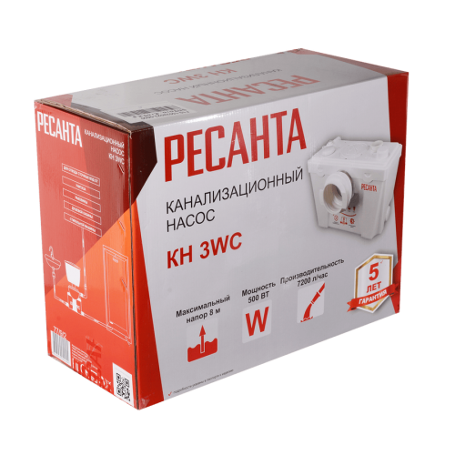 Канализационный насос Ресанта КН 3WC с двигателем мощностью 500 Вт - эффективный способ откачивания сточных вод. Используется в загородных и дачных домах, если санузел располагается ниже уровня основной канализации или находится на большом расстоянии от стояка. Высота подъема составляет максимальное расстояние, на которое насос перемещает жидкость вертикально. Она равна 8 м. По горизонтали максимального напора можно добиться на расстоянии до 80 м. За минуту агрегат способен выкачивать до 120 л воды температурой не более 60°C.