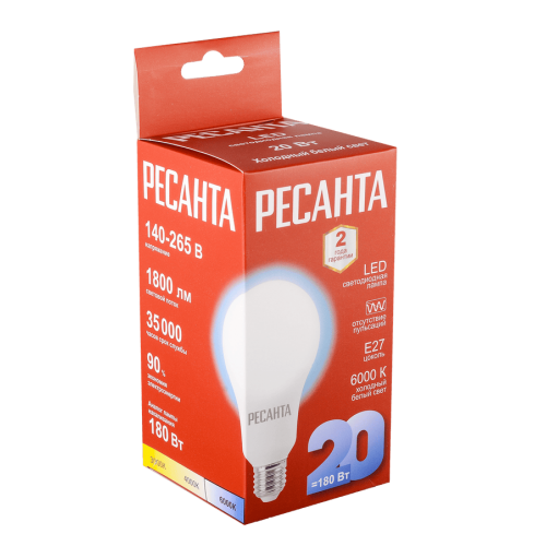 Лампа светодиодная Ресанта LL-R-A80-20W-230-6K-E27