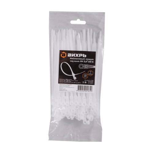 Хомут нейлоновый Вихрь 3,6х150 Б с отверстием под винт предназначен для крепления кабелей, проводов, гофротруб и других предметов к поверхности или для их соединения между собой. Этот крепежный элемент изготавливается из белого нейлона, что гарантирует его прочность и эластичность. Длина стяжки - 15 см, ширина - 3,6 мм.