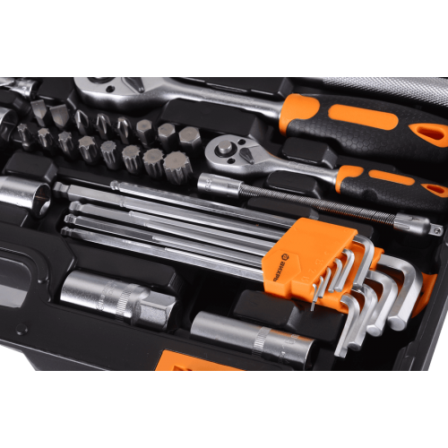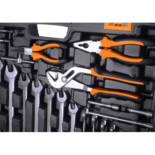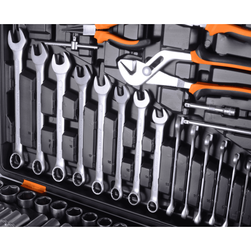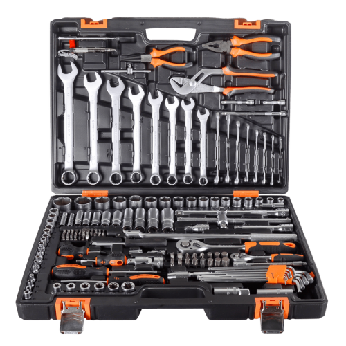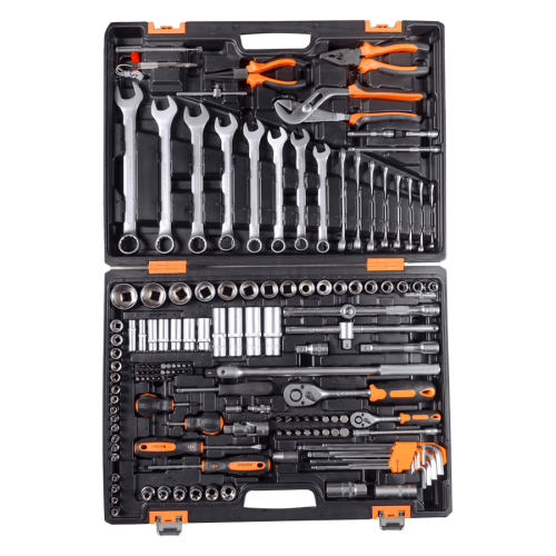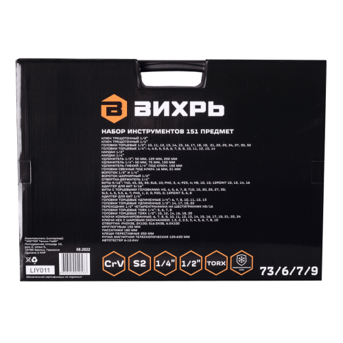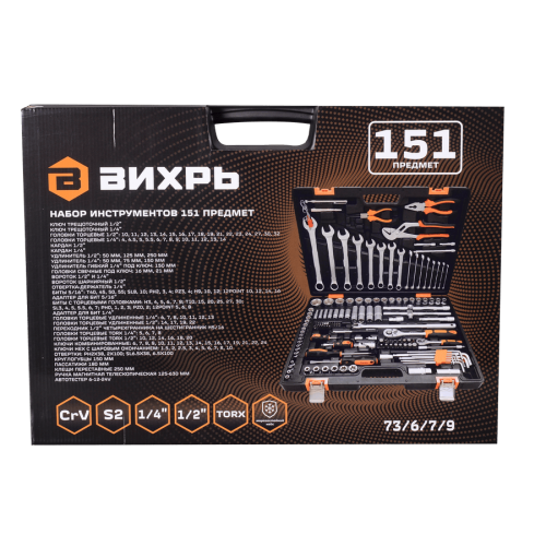 Набор инструментов Вихрь 1/2", 1/4" из стали CrV в кейсе состоит из 151 предмета. Подходит не только для домашней эксплуатации, но и профессионального ремонта автомобильной и мототехники, агрегатов для ухода за садом, огородом и приусадебным участком. Насадки и ключи выполнены из хромванадиевой стали, отличаются устойчивостью к повреждениям и малым весом. Биты, вставные элементы и отвертки выполнены из сплава S2. Для удобства хранения и транспортировки предусмотрен кейс из прочного морозостойкого пластика.