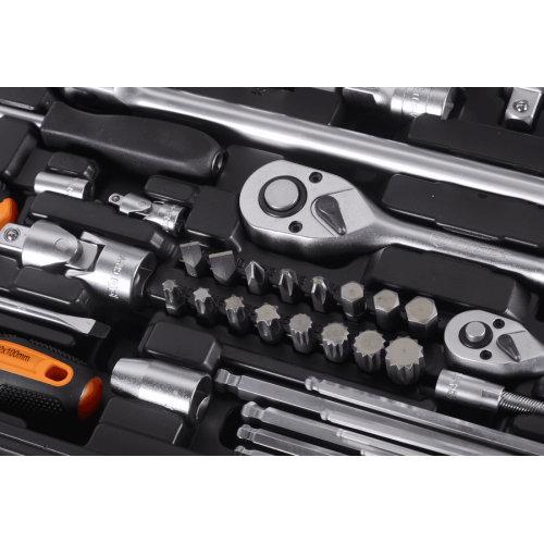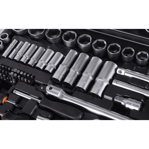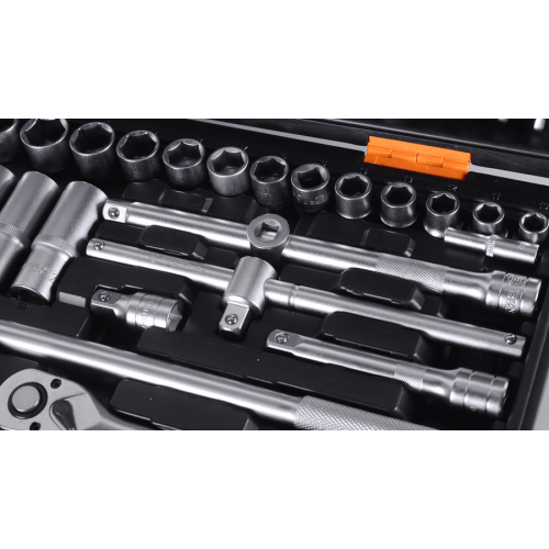 Расширенная комплектация позволяет быстро решать различные задачи. Трещоточные ключи 1/2" и 1/4" с 72-зубцовым механизмом имеют плавный ход и угол поворота 5º, отличаются быстрой заменой насадок. Торцевые насадки 1/2" представлены в диапазоне размеров 10-32.