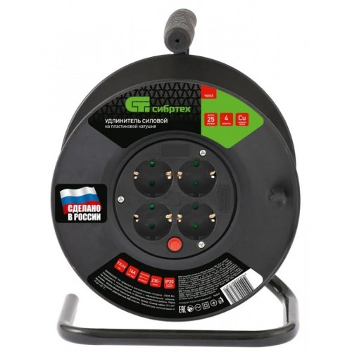 Удлинитель силовой 25 м, 16А, тип УХз16, ПВС, на кабельной катушке, 4 розетки СИБРТЕХ 96045