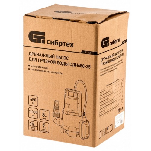 Дренажный насос для грязной воды СДН650-35, 650 Вт, напор 8 м, 11000 л/ч СИБРТЕХ 97264