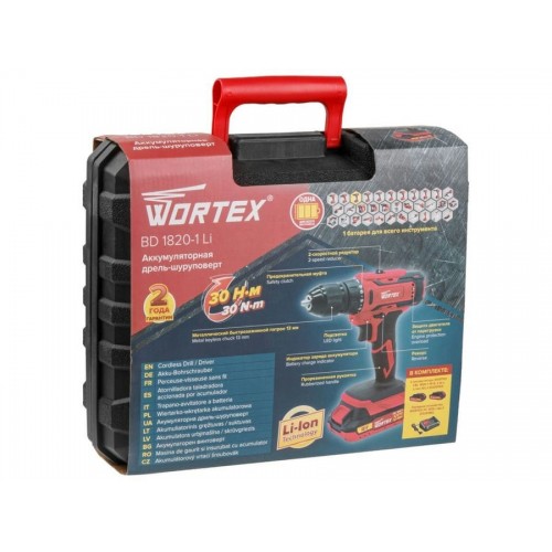 Аккум. дрель-шуруповерт WORTEX BD 1820-1 Li в чем. ALL1 18 В, 30 Н*м, 2х2 А*ч, БЗП(мет.) 13 мм (шурупы до 8 мм)