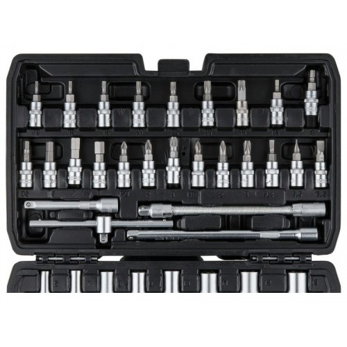 + Головка торцевая 1/4:4, 4.5, 5, 5.5, 6, 7, 8, 9, 10, 11, 12, 13 мм; + Головка торцевая длинная 1/4: 6, 7, 8, 9, 10, 11, 12, 13 мм; + Головка торцевая 1/4: E4, E5, E6, E7, E8, E10; + Головка с насадкой HEX 1/4: H3, H4, H5, H6, H7, H8; + Головка с насадкой TORX 1/4: T8, T10, T15, T20, T25, T30, T40; + Головка с насадкой SL 1/4: SL4, SL5.5, SL6.5; + Головка с насадкой PH 1/4: PH1, PH2, PH3; + Головка с насадкой PZ 1/4: PZ1, PZ2, PZ3; + Трещотка 1/4; + Удлинитель 1/4 75 мм; + Удлинитель 1/4 150 мм; + Кардан 1/4; + Вороток-отвертка 1/4 150 мм; + Вороток 1/4 с плавающей головкой 115 мм; + Гибкий удлинитель 1/4; + Переходник 1/4(F)х3/8(М); + Кейс