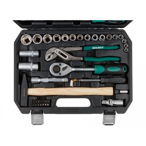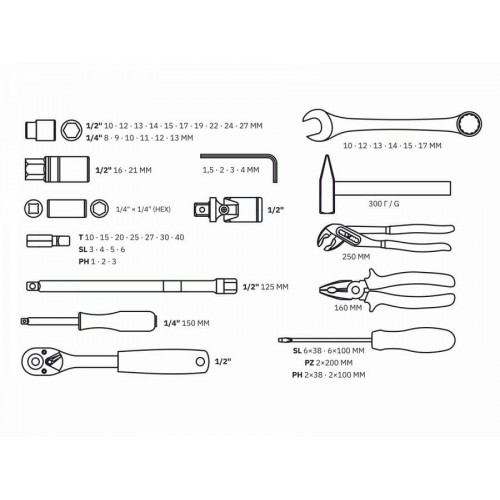 + Головка торцевая 14: 8, 9, 10, 11, 12, 13 мм + Головка торцевая 12: 10, 12, 13, 14, 15, 17, 19, 22, 24, 27 мм; + Свечная головка 12: 16, 21 мм; + Насадка 14 TORX: T10, T15, T20, T25, T27, T30, T40; + Насадка 14 PH: PH1, PH2, PH3; + Насадка 14 SL: SL3, SL4, SL5, SL6; + Переходник (держатель для бит) 14х14(HEX); + Вороток-отвертка 14 150 мм; + Трещотка 12; + Удлинитель 12 125 мм; + Кардан 12; + Ключ комбинированный: 10, 12, 13, 14, 15, 17 мм; + Ключ шестигранный Г-обр.: 1.5, 2, 3, 4 мм; + Отвертки: PH2x38, PH2x100, PZ2х200; SL6x38, SL6x100; + Плоскогубцы 160 мм; + Клещи переставные 250 мм; + Молоток с деревянной рукояткой 300 г; + Кейс