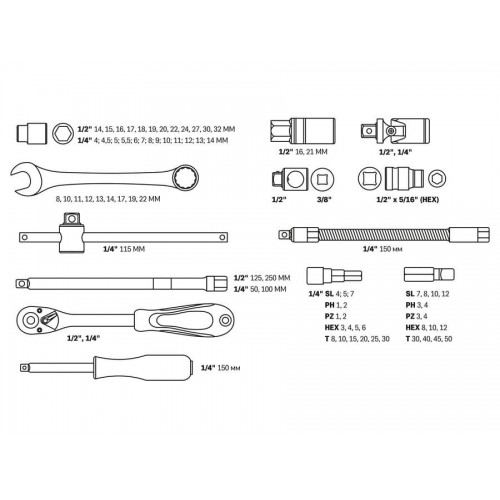 + Головка торцевая 14: 4, 4.5, 5, 5.5, 6, 7, 8, 9, 10, 11, 12, 13 мм; + Головка с насадкой HEX 14: H3, H4, H5, H6; + Головка с насадкой TORX 14: T8, T10, T15, T20, T25, T30; + Головка с насадкой SL 14: SL4, SL5, SL7; + Головка с насадкой PH 14: PH1, PH2; + Головка с насадкой PZ 14: PZ1, PZ2; + Головка торцевая 12: 14, 15, 16, 17, 18, 19, 20, 21, 22, 23, 24, 27, 30, 32 мм; + Свечная головка 12: 16, 21 мм; + Насадка 516 HEX: H8, H10, H12, H14; + Насадка 516 TORX: T40, T45, T50, T55; + Насадка 516 SL: SL7, SL8, SL10, SL12; + Насадка 516 PH: PH3, PH4; + Насадка 516 PZ: PZ3, PZ4; + Трещотка 14; + Удлинитель 14 50 мм; + Удлинитель 14 100 мм; + Кардан 14; + Вороток-отвертка 14 150 мм; + Вороток 14 с плавающей головкой 115 мм; + Гибкий удлинитель 14; + Трещотка 12; + Переходник (держатель для бит) 12х516(HEX); + Удлинитель 12 125 мм; + Удлинитель 12 250 мм; + Кардан 12; + Переходник 38(F)х12(М) с отверстием; + Ключ комбинированный: 8, 10, 11, 12, 13, 14, 17, 19, 22 мм; + Кейс