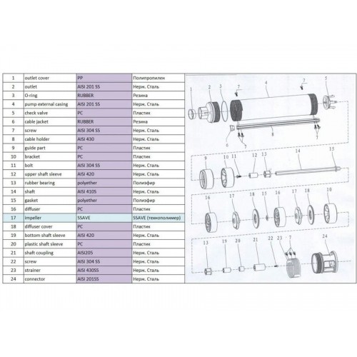 Расшифровка модели насоса на примере: AGELESS-3-210023-28 - Сначала идет серия: AGELESS - серия насосов с 2м кабелем требующим удлинения (вилки нет) GOOD WORK - серия насосов с длинным кабелем вилка - Затем диаметр насоса: 2,5 - диаметр 2,5 дюйма 3 - диаметр 3 дюйма - Далее следует производительность: 210023 - значит, что насос качает 2,1 м3 в час при напоре 23 м - Затем идет обозначение максимальной производительности: 2 - до 3 м3 в час. 3 - до 4 м3 в час - Количество рабочих колёс обозначается последней цифрой: - Обозначение наличия пусковой коробки: А (буква А есть) - пусковой коробки нет (значит конденсатор внутри корпуса насоса кабель трехжильный) (буквы А нет) - пусковая коробка есть (значит конденсатор внутри коробки кабель четырехжильный)