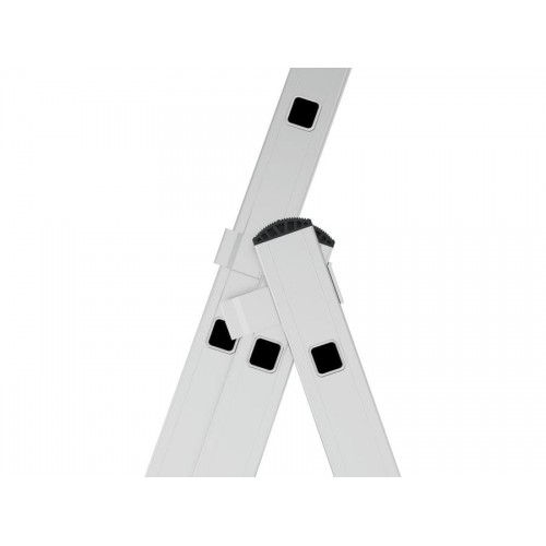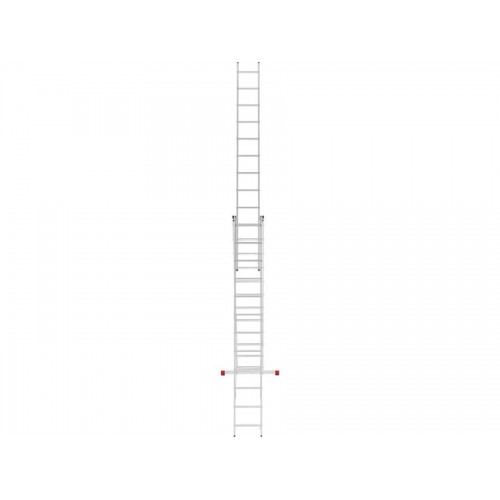 Высота лестницы - 787см, высота стремянки - 299см, высота секции - 316см. Макс. нагрузка -150 кг. Варианты использования: - приставная лестница; - приставная выдвижная лестница; - стремянка; - стремянка с выдвинутой секцией; - функция лестничных пролётов. Технические преимущества: - максимальная прочность и надёжность при небольшом весе изделия; - стойки и ступени изготовлены из прессованного профиля; - многократная развальцовка в соединении ступеней со стойками обеспечивает высокую прочность и долговечность; - рифлёные ступени с шагом 260 мм для безопасного подъёма и спуска; - алюминиевые направляющие кронштейны надёжно удерживают выдвижную секцию во всех рабочих положениях; - зацепы с автоматическим фиксатором; - широкая поперечная траверса обеспечивает высокую устойчивость; - функция лестничных пролётов; - надёжно закреплённые на стойках и траверсе пластиковые наконечники препятствуют скольжению; - верхняя секция легко вынимается и устанавливается и может служить отдельной приставной лестницей; - функция лестничных пролётов с использованием верхней съёмной секции.