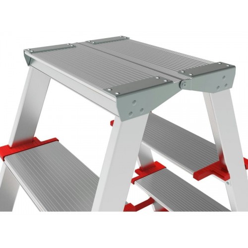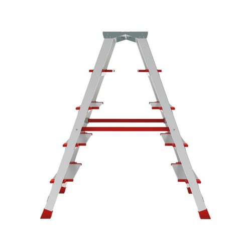 Ориентация ступеней на обе стороны позволяет работать, не переставляя стремянку и тем самым экономя время Максимальная прочность и надёжность при небольшом весе изделия Легко устанавливается и обеспечивает высокий уровень комфорта Стойки и ступени из экструдированных алюминиевых профилей увеличенного сечения Ступени глубиной 130 мм увеличенной толщины Рифлёная поверхность ступеней для безопасного подъёма и спуска Увеличенная площадка 260?350 мм Прочное крепление ступеней к боковинам шестью заклёпками для более высокой устойчивости конструкции Прочные страховочные ремни Опорные наконечники из прочного пластика для устойчивого положения Компактность при хранении и транспортировке Практичность и внимание к каждой детали гарантируют безопасность работы на любой высоте