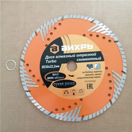 Диск алмазный отрезной Турбо - сегментный, 230 х 22,2 мм, сухая резка Вихрь - это алмазный отрезной диск, который используется совместно с угловыми шлифмашинами (болгарками) для сухой резки гранитных, бетонных, кирпичных и каменных изделий.