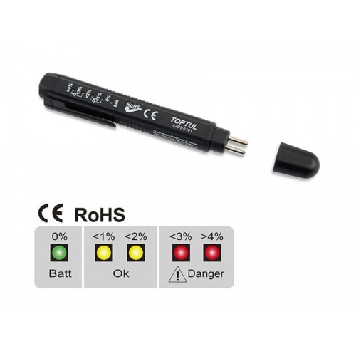 Тестер тормозной жидкости TOPTUL JJDB0101 предназначен для проверки качества тормозной жидкости DOT 4. В комплекте батарейка AAA (1.5V). Пять световых индикатора показывают наличие воды: Зелёный - Батарея в порядке. Нулевое содержание воды. ЗелёныйЖелтый - меньше чем 1% воды. ЗелёныйЖелтыйЖелтый - приблизительно 2%. ЗелёныйЖелтыйЖелтыйКрасный - около 3% воды. Тормозную жидкость желательно заменить. ЗелёныйЖелтыйЖелтыйКрасныйКрасный - как минимум 4% воды. Тормозную жидкость следует заменить!