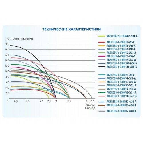 Расшифровка модели насоса на примере: AGELESS-3-210023-28 - Сначала идет серия: AGELESS - серия насосов с 2м кабелем требующим удлинения (вилки нет) GOOD WORK - серия насосов с длинным кабелем вилка - Затем диаметр насоса: 2,5 - диаметр 2,5 дюйма 3 - диаметр 3 дюйма - Далее следует производительность: 210023 - значит, что насос качает 2,1 м3 в час при напоре 23 м - Затем идет обозначение максимальной производительности: 2 - до 3 м3 в час. 3 - до 4 м3 в час - Количество рабочих колёс обозначается последней цифрой: - Обозначение наличия пусковой коробки: А (буква А есть) - пусковой коробки нет (значит конденсатор внутри корпуса насоса кабель трехжильный) (буквы А нет) - пусковая коробка есть (значит конденсатор внутри коробки кабель четырехжильный)