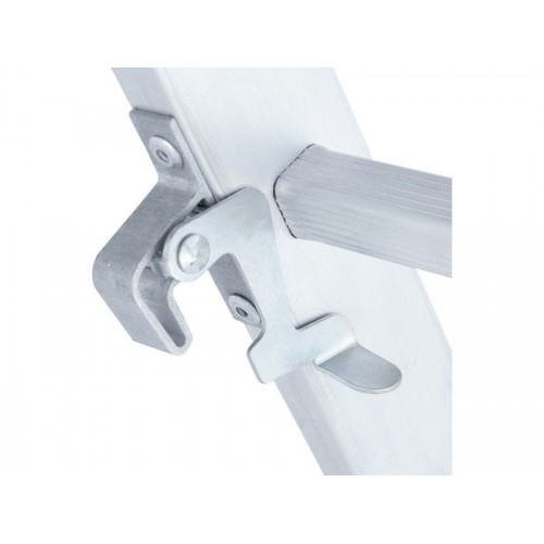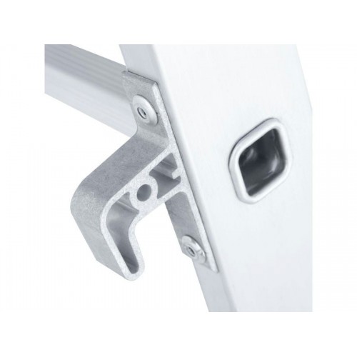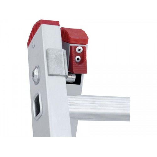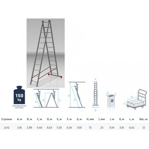 Высота лестницы - 550см, высота стремянки - 299см. Макс. нагрузка -150 кг. Варианты использования: - приставная лестница; - приставная выдвижная лестница; - стремянка. Технические преимущества: - максимальная прочность и надёжность при небольшом весе изделия; - стойки и ступени изготовлены из прессованного профиля; - многократная развальцовка в соединении ступеней со стойками обеспечивает высокую прочность и долговечность; - рифлёные ступени с шагом 260мм для безопасного подъёма и спуска; - алюминиевые направляющие кронштейны надёжно удерживают выдвижную секцию во всех рабочих положениях; - зацепы с автоматическим фиксатором; - широкая поперечная траверса обеспечивает высокую устойчивость; - надёжно закреплённые на стойках и траверсе пластиковые наконечники препятствуют скольжению.